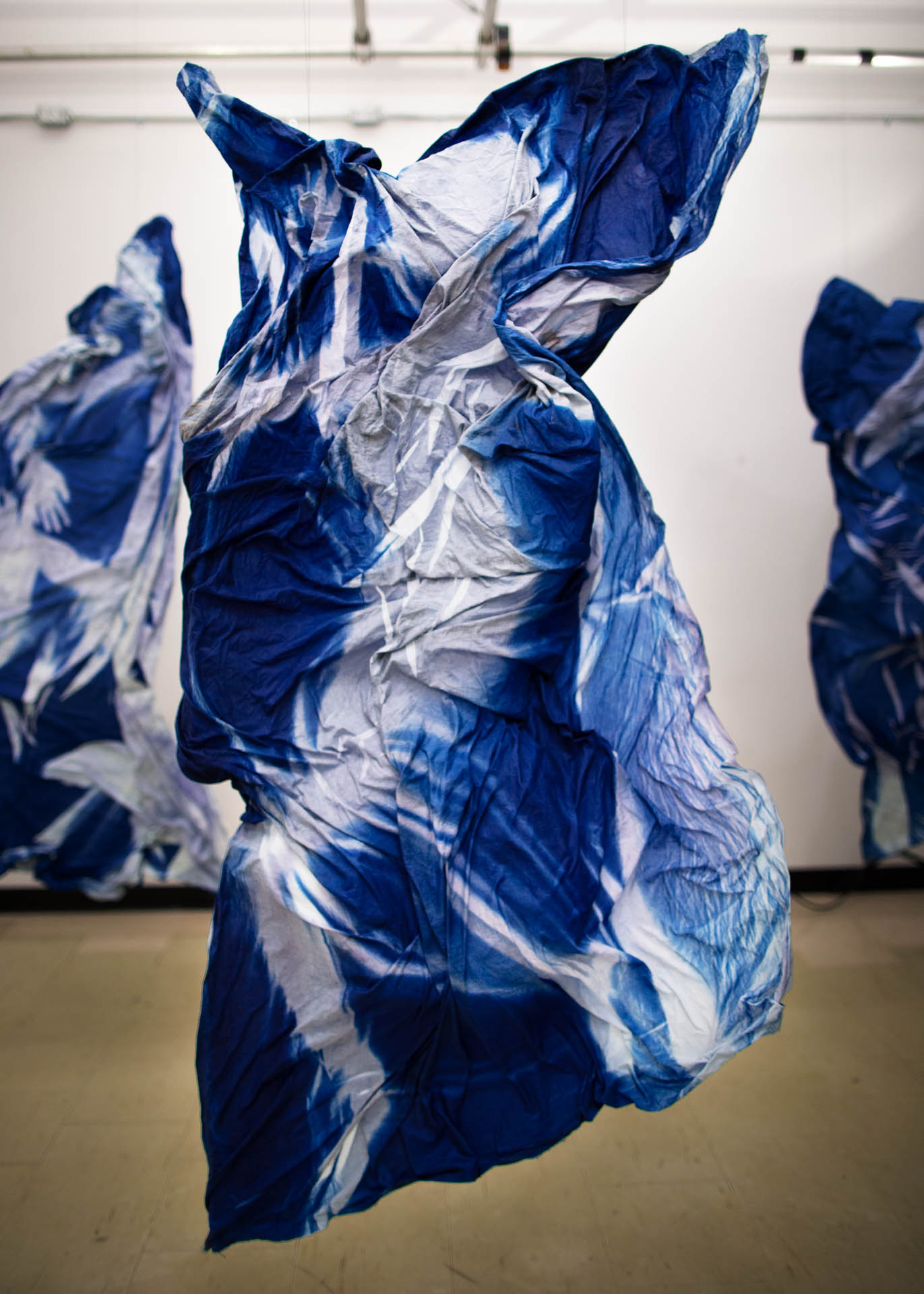 With My Whole Body is a series of fabric cyanotypes, exposed from within the grasp of the artist, that have been sculpted into three-dimensional forms. Through an elongation of exposure, the images combine fragments of the body with motions of the surface to produce collaborative and visceral abstractions. Liberating my being from the voyeuristic lens, I complicate a strict separation between maker and medium. This redefinition of the photographic moment invites the viewer to consider the nature of photography, informed by feminine experience, and question what it means to produce a photographic likeness.