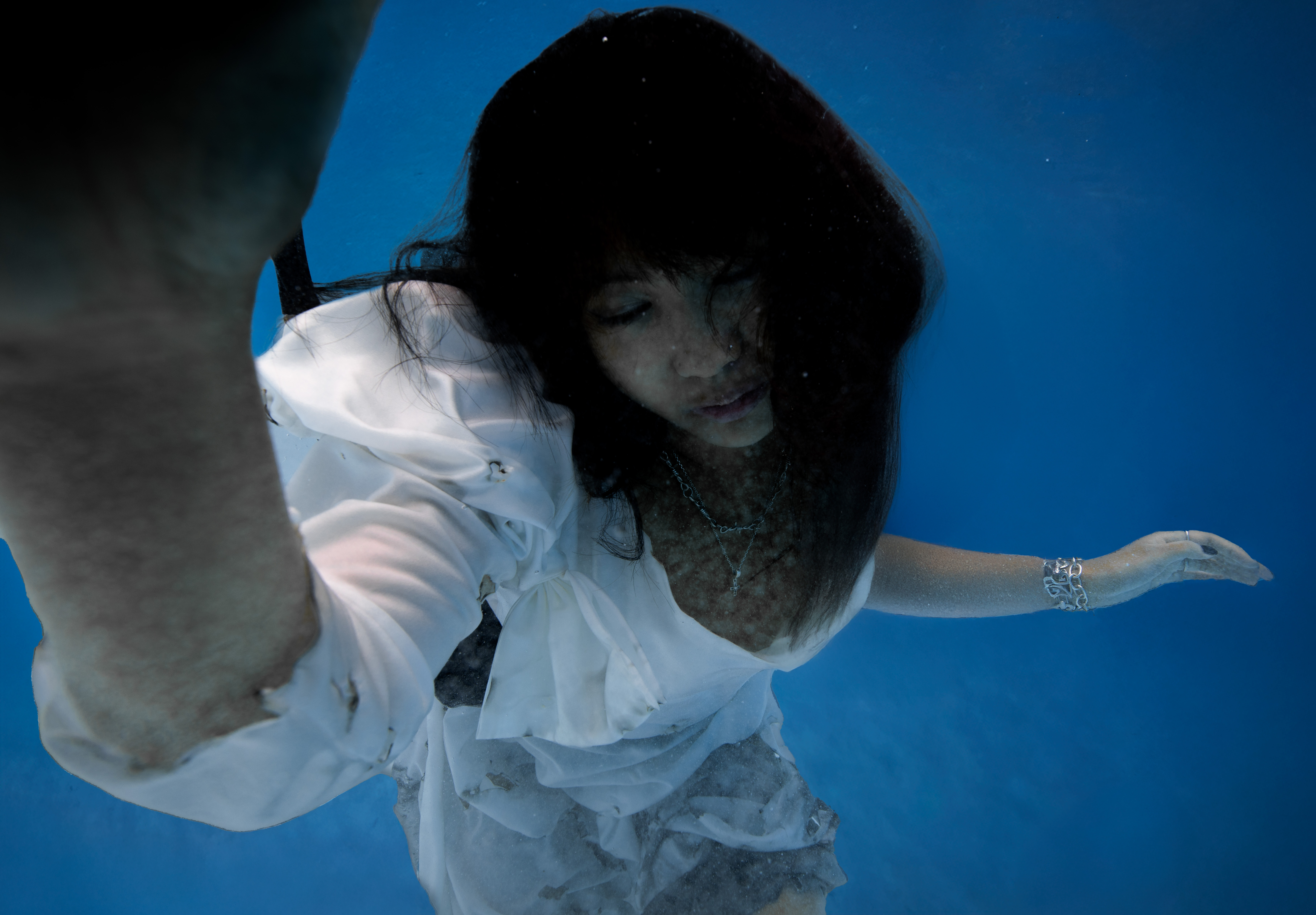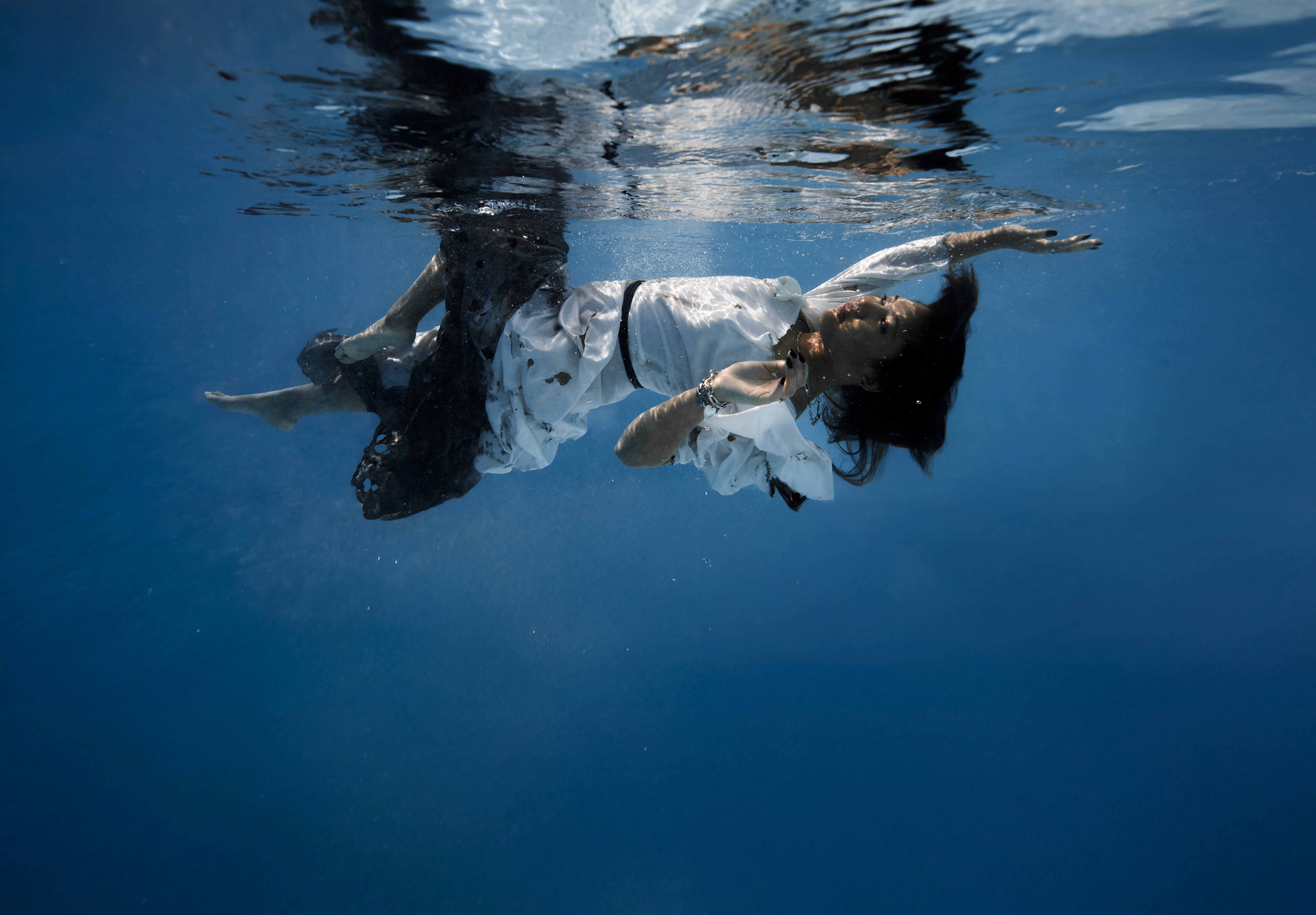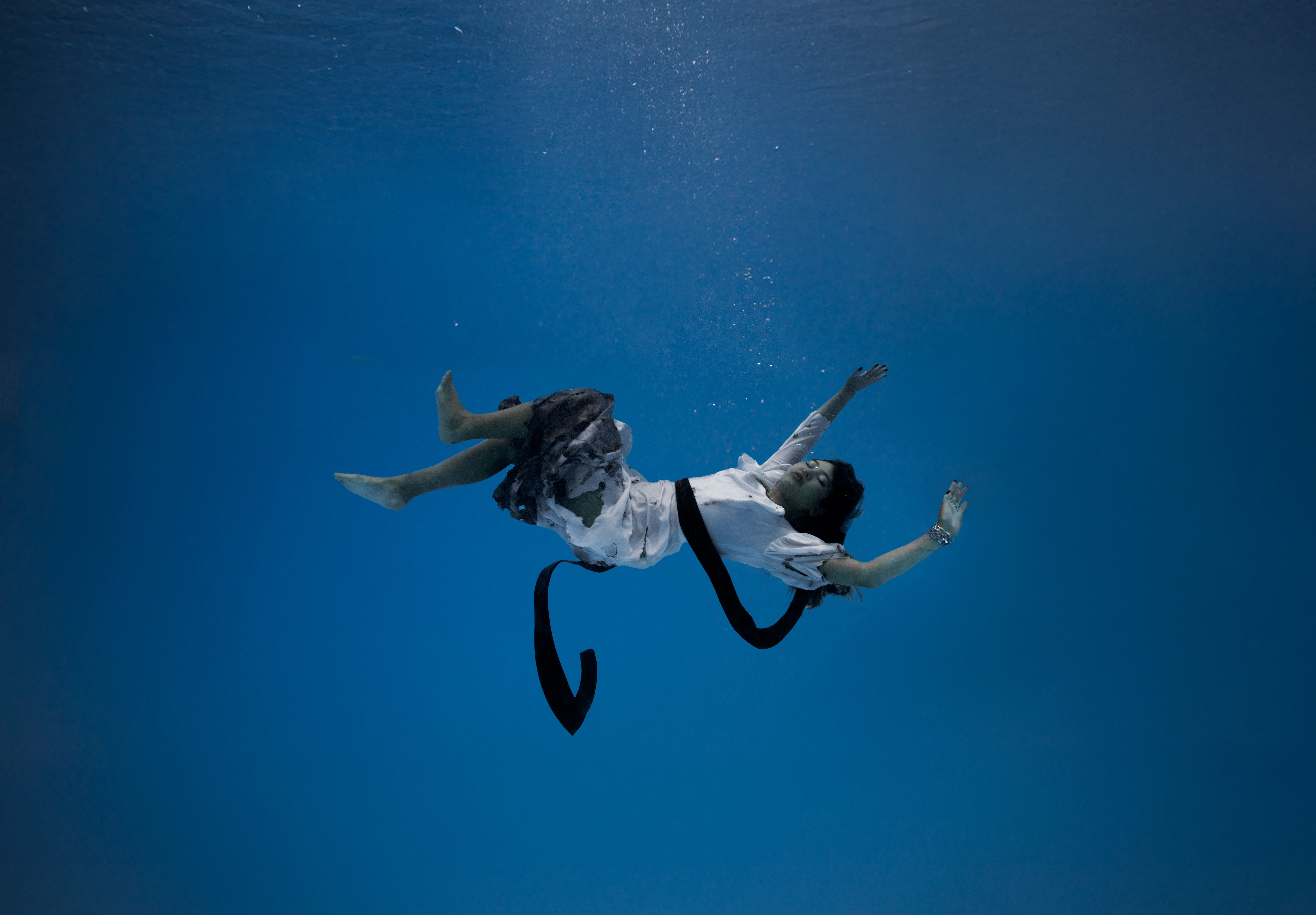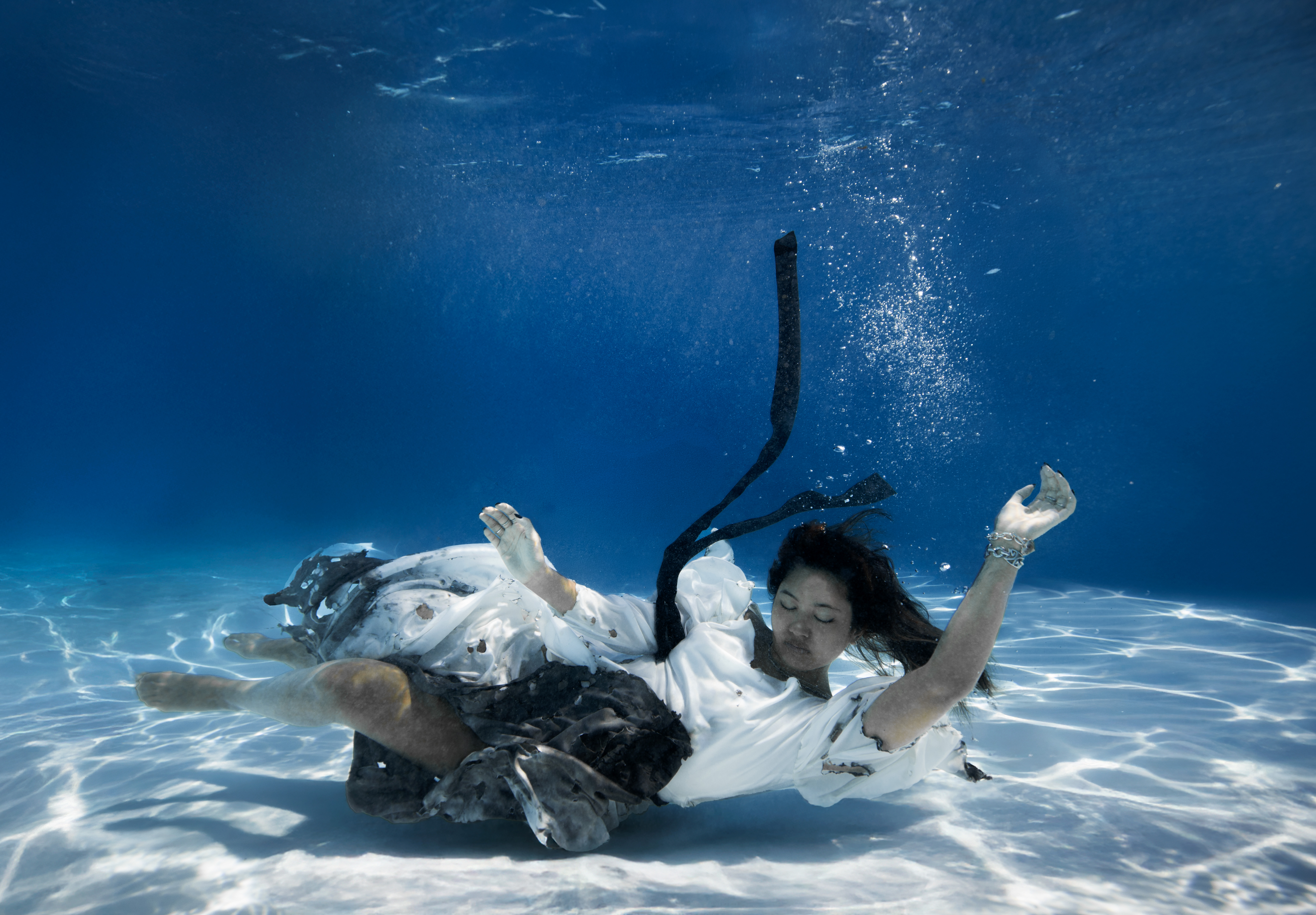 This series is a combined practice of studio and underwater photography. It has an editorial curation where each styling and setting reflects the emotional phases of the subject’s journey. In the first phase, the subject is trapped in the void of fear and uncertainty. She is wearing a black dress and dark make-up to represent the fear of failure that hinders her from moving forward or taking action to accomplish her dream. Then she fell underwater, where she suffered and persevered. Her dress has become torn and stained, which signifies the hardships she’s gone through. Lastly, she had an epiphany. She finally submerged into the space where she finds peace and clarity. Dressed in white and wearing makeup that accentuates her realization. In the final phase, she realizes the true value of her journey. Although she didn’t achieve her goal, she sees the progress she made despite the fact that she is still young and has a long way to go. My thesis aims to picture the personal experiences of overcoming adversity. My work conveys the themes of vulnerability and resilience.