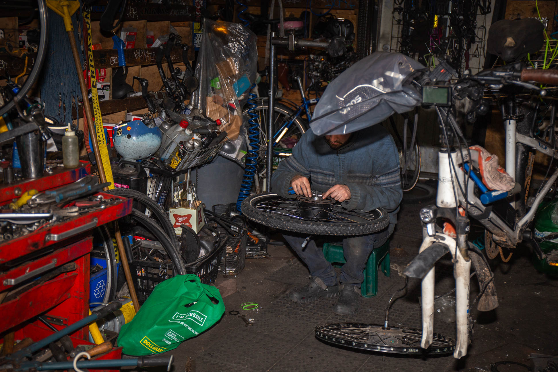 Cyclemania is an intimate study of a bike mechanic’s workspace — a space shaped over years of practice into something entirely personal. The environment has been continuously adapted to fit its owner’s needs, creating an organized chaos that functions as a kind of self-portrait. What appears as disorder to an outside eye carries its own logic, its own memory. The series examines the quiet relationship between a maker and the space they inhabit, and what that space reveals about the person who built it.